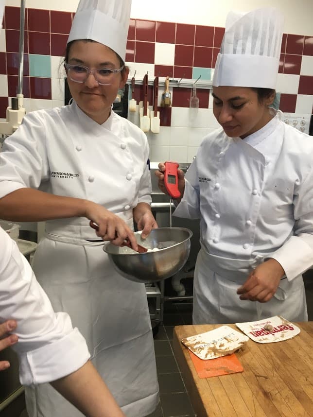 Tufts graduate students, Claire Loudis, Tetyana Pecherska, and Nayla Bezares, at a JWU master baking class